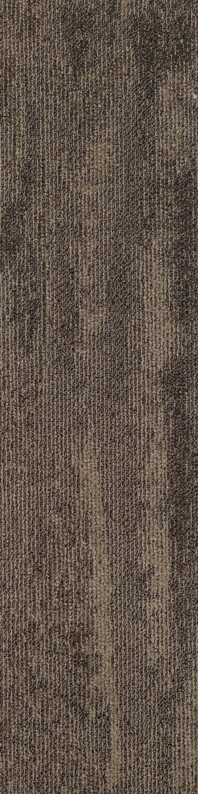 Nylon carpet tiles in plank format on PVC backing in abstract pattern.