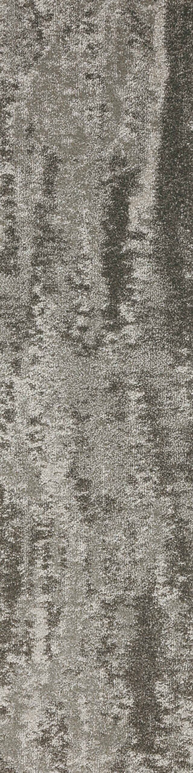 Nylon carpet tiles in plank format on PVC backing in abstract pattern.