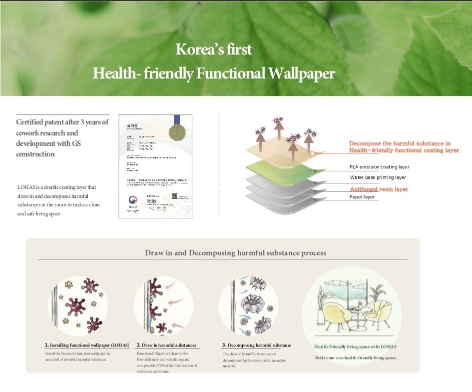 Besides, this Korean Wallpaper for walls is applied with an Antifungal functional layer. This wallpaper has a Plant-based resin (PLA) coating made from Natural Corn. Additionally, Lohas Korean Wallpapers for walls are GREENGUARD GOLD Certified for low chemical emissions.
