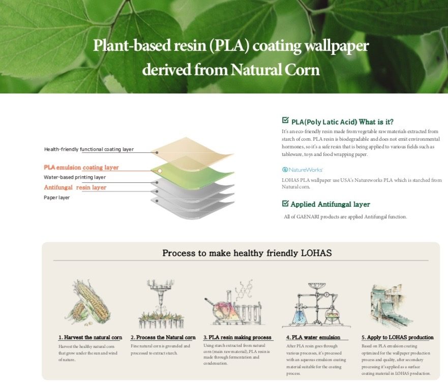 LOHAS PLA *coating wallpaper for walls uses USA’s Natureworks PLA which is starched from Natural Corn.